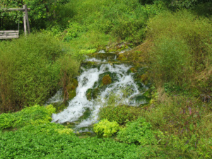 Winnebago Springs, located on private property in the beautiful hills outside of Caledonia, Minn. The crystal-clear spring water gently bubbles over rocks and through soft, lush green grass. The spring joins one of many trout streams in Bluff Country.